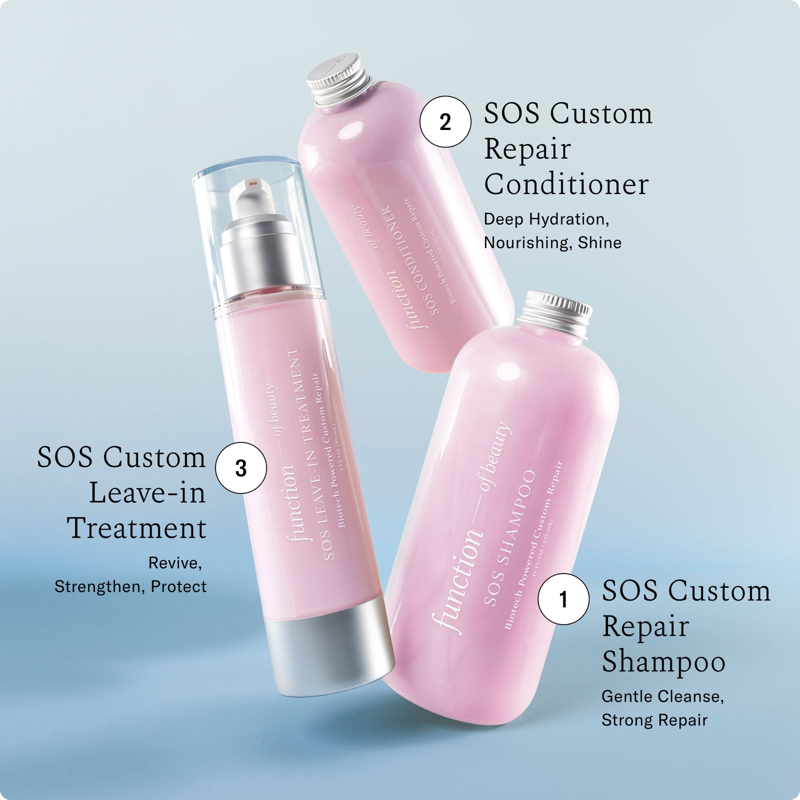 [ { "header": "What type of hair does SOS Custom Repair work for?", "body": "SOS Custom Repair works for all types, thanks to a two-minute quiz that generates a custom formula based on your exact needs" }, { "header": "How do I create my SOS Custom Repair routine?", "body": "Simply take our quick, two-minute quiz that assesses your damage level across chemical, mechanical, and heat styling. Based on your results, we'll recommend a tailored routine of custom-made products to help you achieve your healthiest hair yet." }, { "header": "Do I need to use the full SOS Custom Repair routine?", "body": "For optimal results, we recommend following the complete SOS Custom Repair routine. However, integrating any repair product into your regimen is always beneficial if you're experiencing any type of damage." }, { "header": "Is the SOS Custom Repair routine color-safe?", "body": "Yep! And its not just color-safe; it's also paraben-free, cruelty-free, vegan, and dermatologist-tested." } ]