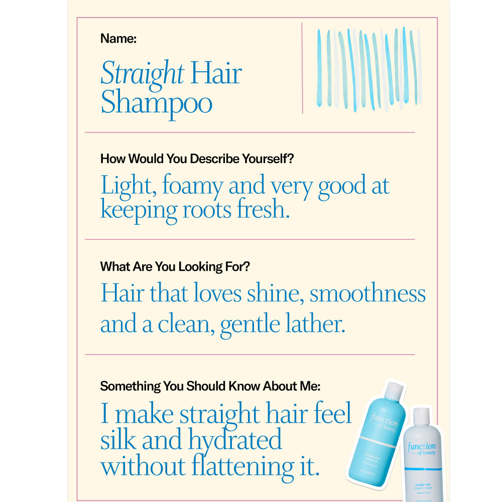 {"id":9342998970680,"title":"Straight Hair Shampoo","handle":"straight-gentle-hair-shampoo","description":"\u003cp\u003eIf your straight hair gets greasy at the roots, dry at the ends or flat by midday, this shampoo is your new fix. Designed for naturally straight hair like \u003cstrong\u003etypes 1A, 1B and 1C\u003c\/strong\u003e, our Straight Hair Shampoo delivers a \u003cstrong\u003egentle, lightweight clean that removes oil and buildup without stripping. \u003c\/strong\u003e\u003c\/p\u003e\n\u003cp\u003e \u003c\/p\u003e\n\u003cp\u003eCustomize your wash by adding up to 3 hair goal booster shots. Straight-hair staples include Volumize for lift, Strengthen for softer strands and Anti-Frizz for a sleek, smooth finish.\u003c\/p\u003e\n\u003cp\u003e \u003c\/p\u003e\n\u003cp\u003eSize: 11 oz\u003c\/p\u003e\n\u003c!----\u003e","published_at":"2024-06-05T10:34:45-04:00","created_at":"2024-05-16T16:25:51-04:00","vendor":"Function of Beauty","type":"","tags":["Haircare"],"price":999,"price_min":999,"price_max":999,"available":true,"price_varies":false,"compare_at_price":null,"compare_at_price_min":0,"compare_at_price_max":0,"compare_at_price_varies":false,"variants":[{"id":48680749072696,"title":"11 oz","option1":"11 oz","option2":null,"option3":null,"sku":"straight-hair-gentle-shampoo","requires_shipping":true,"taxable":true,"featured_image":{"id":45956408803640,"product_id":9342998970680,"position":1,"created_at":"2024-05-20T12:20:42-04:00","updated_at":"2024-05-20T12:21:04-04:00","alt":null,"width":2160,"height":2160,"src":"\/\/functionofbeauty.com\/cdn\/shop\/files\/TARGETDTC_PDP_StraightSH1.jpg?v=1716222064","variant_ids":[48680749072696]},"available":true,"name":"Straight Hair Shampoo - 11 oz","public_title":"11 oz","options":["11 oz"],"price":999,"weight":0,"compare_at_price":null,"inventory_management":"shopify","barcode":"","featured_media":{"alt":null,"id":38465683685688,"position":1,"preview_image":{"aspect_ratio":1.0,"height":2160,"width":2160,"src":"\/\/functionofbeauty.com\/cdn\/shop\/files\/TARGETDTC_PDP_StraightSH1.jpg?v=1716222064"}},"requires_selling_plan":false,"selling_plan_allocations":[{"price_adjustments":[{"position":1,"price":999}],"price":999,"compare_at_price":999,"per_delivery_price":999,"selling_plan_id":695958143288,"selling_plan_group_id":"a9e1ee73add5a6930b96a9efcc2fba66a8cb0620"},{"price_adjustments":[{"position":1,"price":999}],"price":999,"compare_at_price":999,"per_delivery_price":999,"selling_plan_id":695958176056,"selling_plan_group_id":"a9e1ee73add5a6930b96a9efcc2fba66a8cb0620"},{"price_adjustments":[{"position":1,"price":999}],"price":999,"compare_at_price":999,"per_delivery_price":999,"selling_plan_id":695958208824,"selling_plan_group_id":"a9e1ee73add5a6930b96a9efcc2fba66a8cb0620"},{"price_adjustments":[{"position":1,"price":999}],"price":999,"compare_at_price":999,"per_delivery_price":999,"selling_plan_id":695958241592,"selling_plan_group_id":"a9e1ee73add5a6930b96a9efcc2fba66a8cb0620"},{"price_adjustments":[{"position":1,"price":999}],"price":999,"compare_at_price":999,"per_delivery_price":999,"selling_plan_id":695958274360,"selling_plan_group_id":"a9e1ee73add5a6930b96a9efcc2fba66a8cb0620"}],"quantity_rule":{"min":1,"max":null,"increment":1}}],"images":["\/\/functionofbeauty.com\/cdn\/shop\/files\/TARGETDTC_PDP_StraightSH1.jpg?v=1716222064","\/\/functionofbeauty.com\/cdn\/shop\/files\/Straight_2.jpg?v=1769552890","\/\/functionofbeauty.com\/cdn\/shop\/files\/Straight_1.jpg?v=1769552890","\/\/functionofbeauty.com\/cdn\/shop\/files\/Straight_3.jpg?v=1769552914","\/\/functionofbeauty.com\/cdn\/shop\/files\/Straight_4.jpg?v=1769552951","\/\/functionofbeauty.com\/cdn\/shop\/files\/TARGETDTC_PDP_StraightSH5.jpg?v=1769552951"],"featured_image":"\/\/functionofbeauty.com\/cdn\/shop\/files\/TARGETDTC_PDP_StraightSH1.jpg?v=1716222064","options":["Size"],"media":[{"alt":null,"id":38465683685688,"position":1,"preview_image":{"aspect_ratio":1.0,"height":2160,"width":2160,"src":"\/\/functionofbeauty.com\/cdn\/shop\/files\/TARGETDTC_PDP_StraightSH1.jpg?v=1716222064"},"aspect_ratio":1.0,"height":2160,"media_type":"image","src":"\/\/functionofbeauty.com\/cdn\/shop\/files\/TARGETDTC_PDP_StraightSH1.jpg?v=1716222064","width":2160},{"alt":null,"id":45851578073400,"position":2,"preview_image":{"aspect_ratio":1.0,"height":800,"width":800,"src":"\/\/functionofbeauty.com\/cdn\/shop\/files\/Straight_2.jpg?v=1769552890"},"aspect_ratio":1.0,"height":800,"media_type":"image","src":"\/\/functionofbeauty.com\/cdn\/shop\/files\/Straight_2.jpg?v=1769552890","width":800},{"alt":null,"id":45851577844024,"position":3,"preview_image":{"aspect_ratio":1.0,"height":800,"width":800,"src":"\/\/functionofbeauty.com\/cdn\/shop\/files\/Straight_1.jpg?v=1769552890"},"aspect_ratio":1.0,"height":800,"media_type":"image","src":"\/\/functionofbeauty.com\/cdn\/shop\/files\/Straight_1.jpg?v=1769552890","width":800},{"alt":null,"id":45851578138936,"position":4,"preview_image":{"aspect_ratio":1.0,"height":800,"width":800,"src":"\/\/functionofbeauty.com\/cdn\/shop\/files\/Straight_3.jpg?v=1769552914"},"aspect_ratio":1.0,"height":800,"media_type":"image","src":"\/\/functionofbeauty.com\/cdn\/shop\/files\/Straight_3.jpg?v=1769552914","width":800},{"alt":null,"id":45851578106168,"position":5,"preview_image":{"aspect_ratio":1.0,"height":1000,"width":1000,"src":"\/\/functionofbeauty.com\/cdn\/shop\/files\/Straight_4.jpg?v=1769552951"},"aspect_ratio":1.0,"height":1000,"media_type":"image","src":"\/\/functionofbeauty.com\/cdn\/shop\/files\/Straight_4.jpg?v=1769552951","width":1000},{"alt":null,"id":38465683816760,"position":6,"preview_image":{"aspect_ratio":1.0,"height":2160,"width":2160,"src":"\/\/functionofbeauty.com\/cdn\/shop\/files\/TARGETDTC_PDP_StraightSH5.jpg?v=1769552951"},"aspect_ratio":1.0,"height":2160,"media_type":"image","src":"\/\/functionofbeauty.com\/cdn\/shop\/files\/TARGETDTC_PDP_StraightSH5.jpg?v=1769552951","width":2160}],"requires_selling_plan":false,"selling_plan_groups":[{"id":"a9e1ee73add5